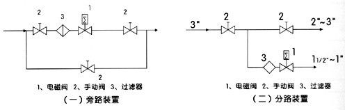1、安裝時電磁閥線圈向上,并保持垂直位置,電磁閥上箭頭或標記應與管道流向一致,不得安裝在有濺水或漏水的地方。 2、電磁閥的工作介質(zhì)應清潔無顆粒雜質(zhì),電磁閥內(nèi)件表面上的污物及過濾器,需定期清潔干凈。 3、在電磁閥發(fā)生故障時,為了及時隔離電磁閥,并保證系統(tǒng)正常運行,最好安裝旁路裝置(如圖一)。 4、在管路系統(tǒng)中,安裝在支路上的電磁閥通徑應小于主管道閥門的通徑(如圖二)。 5、安裝在電磁閥前,管道必須清洗干凈。建議在閥前安裝過濾器,蒸汽管道安裝疏水閥。 6、不能將閥安裝在管道的低凹處,以免因蒸汽冷凝水、雜質(zhì)等沉淀在閥內(nèi)而妨礙動作。 7、普通型不能在爆炸危險場合使用。 8、在管路剛性不足情況下,建議把閥前管道用支架固定,以免電磁閥工作時引起振動。 9、在安裝前,要注意要看清產(chǎn)品標牌,認真閱讀使用說明書,判斷產(chǎn)品是否符合使用條件。 10、電磁閥前后管道上需安裝壓力表,以便觀察管道壓力。