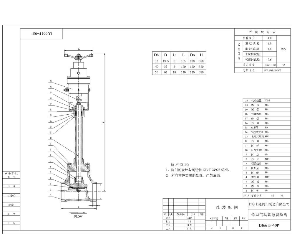 DJ661F-40P_氣動不銹鋼低溫切斷閥圖紙: