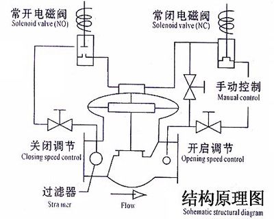 常開(kāi)電磁閥裝在控制回路的上游管路上,常閉電磁閥裝在控制回路的下游管路上。在管道輸送介質(zhì)過(guò)程中,當(dāng)需要開(kāi)啟閥門時(shí), 由計(jì)算機(jī)發(fā)出閥門開(kāi)啟信號(hào),常開(kāi)電磁閥通電(關(guān)閉), 同時(shí)常閉電磁閥通電(開(kāi)啟)。這時(shí), 由上游通向主閥活塞上腔室的通道被截止,主閥活塞上腔室通向下游的通道被導(dǎo)通。此時(shí),活塞下部的介質(zhì)壓力高于上部壓力,主閥活塞上腔室的介質(zhì)通過(guò)常閉電磁閥通道排向下游管道,主閥被打開(kāi)。