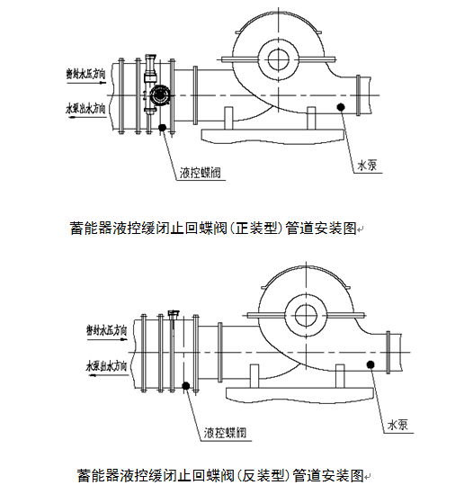 注:液控止回蝶閥閥體上的方向表示閥門的承壓方向,當(dāng)安裝于水泵出口時(shí),閥體上箭頭方向應(yīng)與水泵出水方向相反,且閥門立、臥安裝不影響效果。