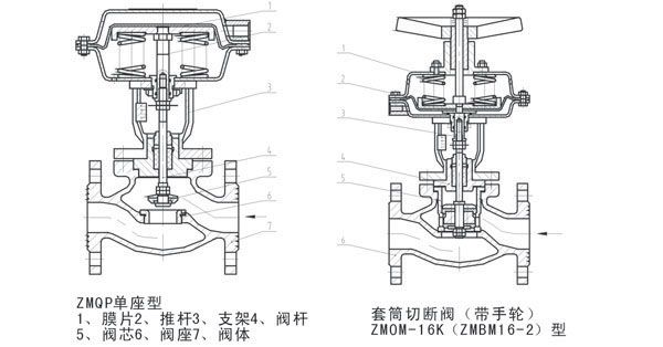 3、 主意務必按ZMQM氣動薄膜套筒切斷所示的介質(zhì)流動方向(閥體上的箭頭)安裝電動單座調(diào)節(jié)閥。