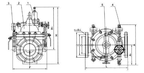 當(dāng)閥門(mén)從進(jìn)口端給水時(shí),水流過(guò)針閥進(jìn)入主閥控制室,出口壓力通過(guò)導(dǎo)管作用到導(dǎo)閥上。當(dāng)出口壓力高于導(dǎo)閥彈簧設(shè)定值時(shí),導(dǎo)閥關(guān)閉。控制室停止排水,此時(shí)主閥控制室內(nèi)壓力升高并關(guān)閉主閥,出口壓力不再升高。