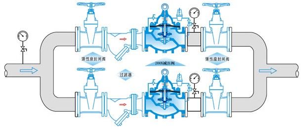 200X減壓穩(wěn)壓閥由主閥、導(dǎo)閥、針閥、球閥、微型過(guò)濾器和壓力表組成水力控制接管系統(tǒng)。使用時(shí),當(dāng)調(diào)定出口壓力后,能自動(dòng)保持穩(wěn)定出口壓力。本產(chǎn)品利用導(dǎo)閥自力控制,不需要其它裝置和能源,保養(yǎng)簡(jiǎn)便,壓力控制準(zhǔn)確度高,受進(jìn)口壓力和流量影響小,減壓穩(wěn)壓可靠。廣泛用于高層建筑、生活區(qū)等供水管網(wǎng)系統(tǒng)及城市供水工程。