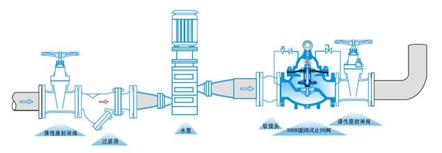 300X緩閉止回閥由主閥、單向閥、針閥、球閥、微形過(guò)濾器和壓力表組成水力控制接管系統(tǒng)。利用水力自動(dòng)操作,可使主閥得到最佳的開啟或關(guān)閉速度。防止水鍾水擊的產(chǎn)生,以達(dá)到緩閉消聲的效果。利用水力自力控制,不需要其它裝置和能源,保養(yǎng)簡(jiǎn)便,開啟及緩閉平穩(wěn)。廣泛用于高層建筑、生活區(qū)等供水管網(wǎng)系統(tǒng)及城市供水工程。
