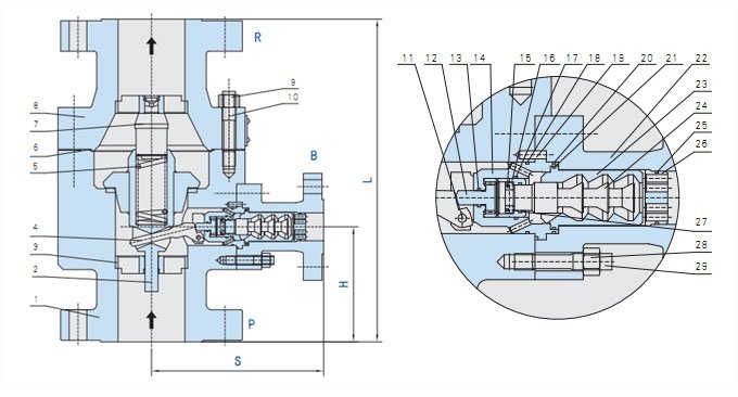 據(jù)感應到的主路流量不同,自動再循環(huán)泵保護閥的主閥瓣止回錐將自動移動到某一個位置上。同時主閥瓣帶動旁路閥閥桿,將主閥瓣動作傳遞至旁路,通過控制旁路閥閥瓣的位置,改變旁路的節(jié)流面積,從而控制通過旁路的流量。當主閥瓣回至閥座關閉狀態(tài)時,所有流量通過旁路回流。當主閥瓣上升至頂端位置時,旁路則完全關閉,所有泵的流量流向工藝系統(tǒng)。該閥集四種功能于一體。