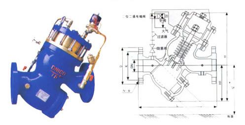 分隔膜型和活塞型兩類,主要部件有一個(gè)主閥及其附設(shè)的導(dǎo)管、導(dǎo)閥、針閥、球閥和壓力表等組成的。它利用上下游壓力差為動(dòng)力,由導(dǎo)閥控制、使隔膜(活塞)上方控制室內(nèi)的壓力水被排到大氣或下游低壓區(qū)時(shí),作用在閥盤底部和隔膜下方的壓力值就大于上方的壓力值,所以將主閥閥盤推到完全開(kāi)啟的位置,當(dāng)進(jìn)入隔膜(活塞)上方控制室內(nèi)的壓力不能排到大氣或下游低區(qū)時(shí),作用在隔膜(活塞)上方的壓力值就大于下方的壓力值,所以就會(huì)把主閥閥盤壓到完全關(guān)閉位置,當(dāng)隔膜(活塞)上方控制室內(nèi)的壓力值處于入口壓力與出口壓力中間時(shí),主閥閥盤就處于調(diào)節(jié)狀態(tài)。