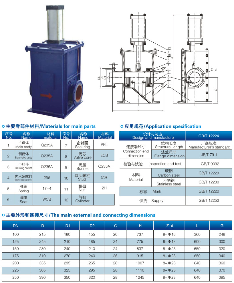 ZQ648TC-10C 庫頂切換閥用于電力工業(yè)氣力輸灰系統(tǒng)管道上,做為灰?guī)熘g切換裝置。當(dāng)氣缸帶動(dòng)芯下行時(shí),與兩端通道接通,此時(shí)干灰通過管輸送到另一座灰?guī)?,?dāng)氣缸.上行時(shí),干灰由下料斗引向下方,直接落入灰?guī)臁?/div>