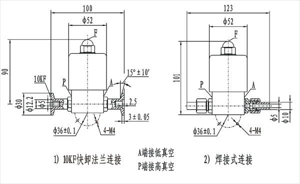 電磁高真空帶充氣閥連接在高低真空系統(tǒng)上,該閥通電閥板打開,同時封閉充氣口,將P、A端管路接通;斷電時閥板關(guān)閉,切斷P、A端管路,保證系統(tǒng)的真空度,同時打開充氣口,通過F端向A端充氣。